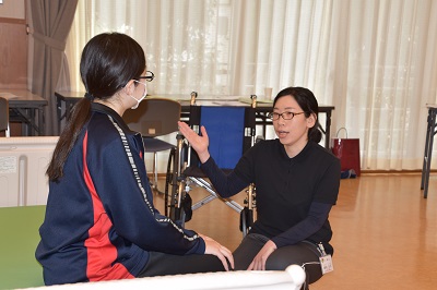 ポイントの「声かけ」「説明して同意を得る」「自立支援」「体調確認」「床に膝をつかない」「ジェスチャーを交える」「安全確認」7点を念頭に置き、声かけの方法や動作を各グループで考えます。